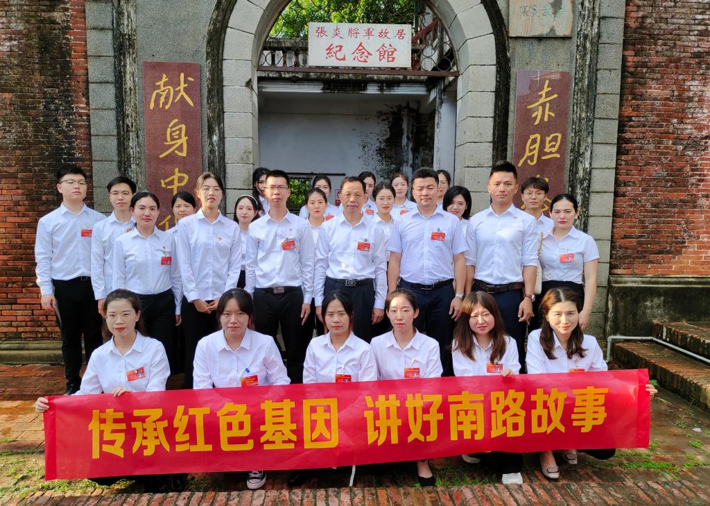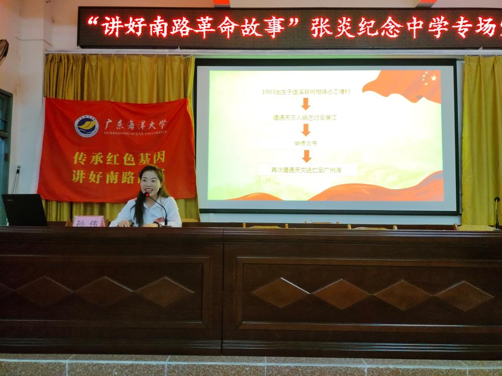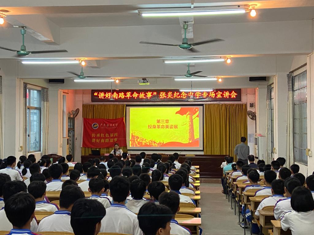 追寻革命原点,赓续红色基因。为扎实推动党史学习教育走进青少年,教育引导青少年学生树立正确的党史观,激发其学习党史知识的热情,把红色传统、红色记忆、红色基因根植于青少年心中,5月12日下午,我校“讲好南路革命故事”宣讲团来到吴川市张炎纪念中学,为在场师生献上了一堂别开生面的党史思政课。吴川市教育局办公室主任郭运昌、杨青,张炎纪念中学校长陈亚润,我校党委研究生工作部副部长陈汉能、宣讲团骨干教员钟桂安、陈淦添、林嘉怡、王自灵、余芬以及20名学生宣讲员参加了宣讲活动。