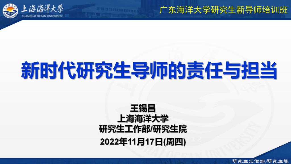 会上,上海海洋大学研究生院执行院长王锡昌教授以“新时代研究生导师的责任与担当”为题,从深刻认识导师队伍建设时代背景出发,进一步解读研究生导师岗位职责,导师要明确自身定位、职责与权利;总结个人多年指导研究生经验,如何与研究生建立“利师”与“利生”互相融合的和谐健康关系,强调研究生导师要具有“道术、学术、技术、艺术、仁术”等五个方面素养。