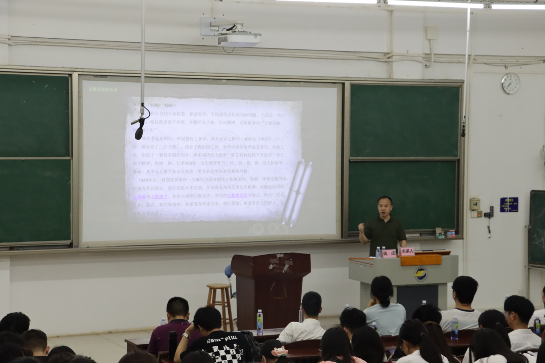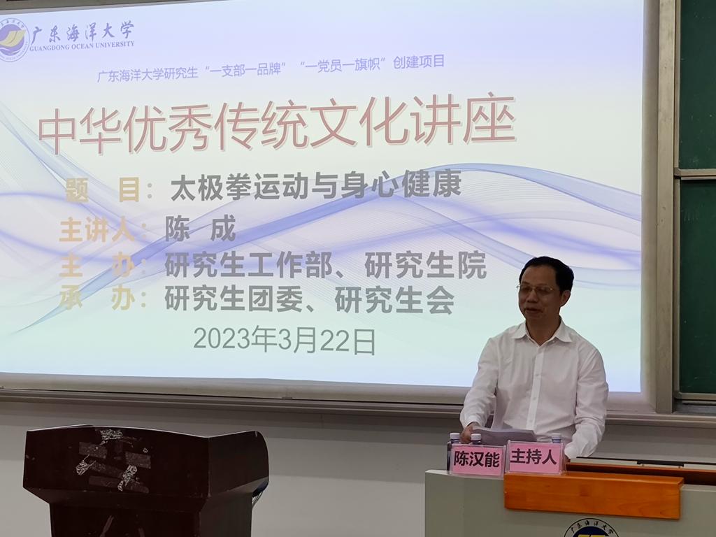 为活跃校园文化活动氛围,丰富校园生活,传承中华优秀文化传统,普及推广太极拳运动,倡导积极健康的生活方式和精神面貌。3月22日晚,研究生工作部、研究生院邀请学校财务处处长陈成老师在钟海楼02030开展以“太极拳运动与身心健康”为主题的中华优秀传统文化讲座,财务处副处长白冰、研究生院党政办公室主任陈淦添等200多名师生参加了讲座。讲座由党委研究生工作部副部长陈汉能主持。